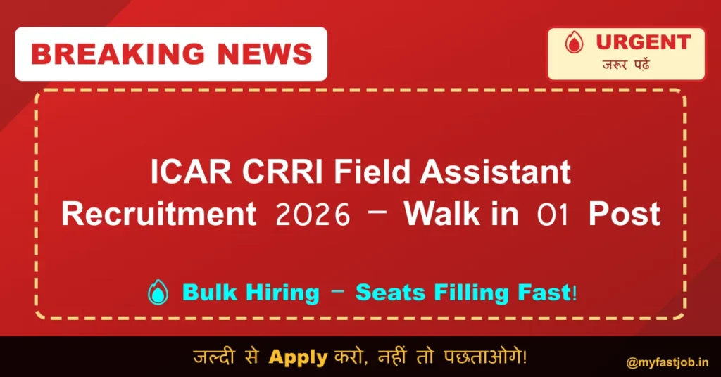 The ICAR – Central Rice Research Institute (CRRI), Cuttack has released an official notification for the recruitment of Field Assistant (FA) under the project “National Mission Mode Program on Nutritional Improvement of Digestible Protein Content and Quality in Rice (EAP-361)”. Eligible candidates are invited to attend the Walk-in-Interview on 12 January 2026 at ICAR-CRRI, Cuttack