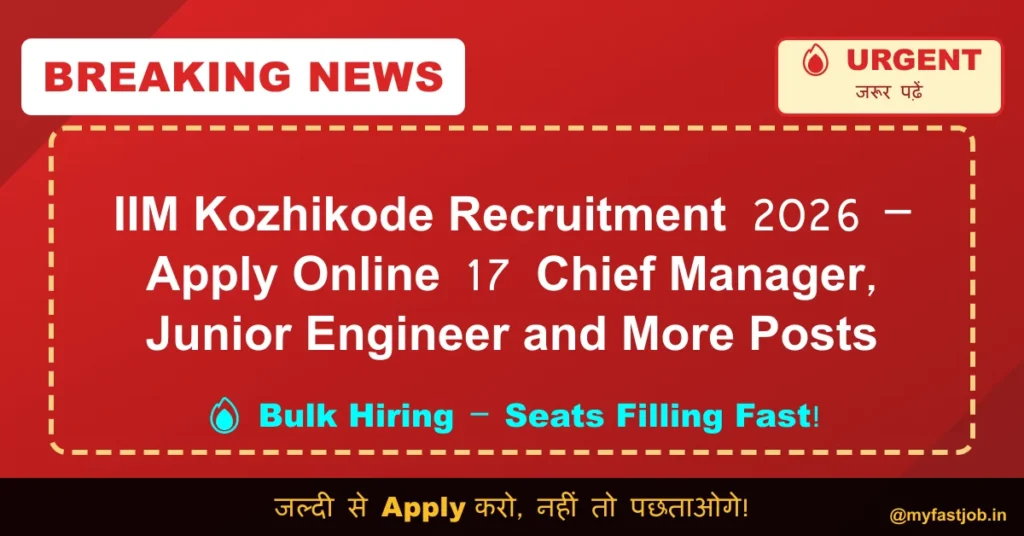 The Indian Institute of Management Kozhikode (IIM Kozhikode) has released the official notification for the recruitment of Chief Manager, Manager, Junior Engineer and Other Various Posts for the year 2026. A total of 17 vacancies are available. Eligible candidates can apply online from 12 December 2025 to 12 January 2026 through the official website iimk.ac.in.