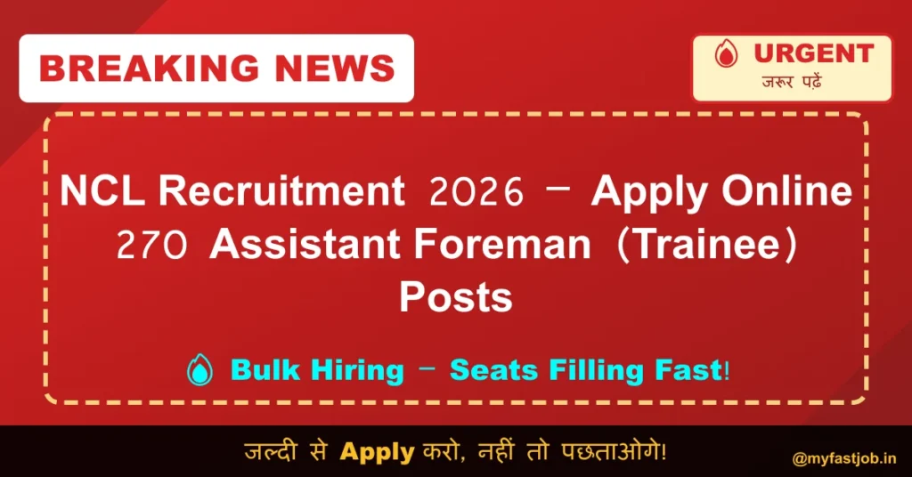 The Northern Coalfields Limited (NCL) has released the official notification for NCL Assistant Foreman (Trainee) Recruitment 2026 for 270 vacancies. Eligible candidates can apply online from 11 February 2026 to 05 March 2026 through the official website nclcil.in.