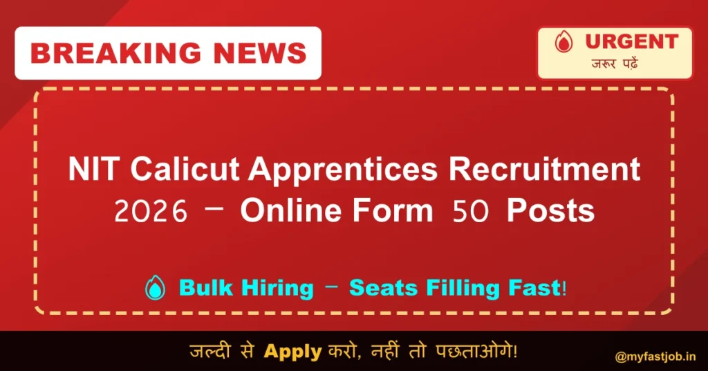 The National Institute of Technology Calicut (NIT Calicut) has released the official notification for the recruitment of Apprentice Trainees (Graduate, Diploma & ITI Trade) for the academic year 2026–27. A total of 50 apprenticeship posts are available under Advertisement No. NITC/CCESD/NATS/AT/2026/001. Eligible candidates can apply online from 24 January 2026 to 09 February 2026 through the official NIT Calicut website.